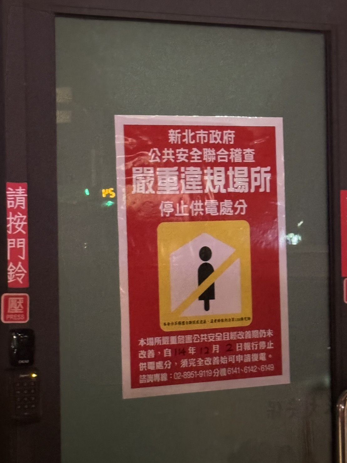 【Lai傳媒、記者爆料網/謝建成/新北報導】新北市政府昨(2)日晚間啟動公安小組跨局處聯合稽查,針對中和區安和路一間外掛「小吃部」名義、實際涉及妨害風化的場所,正式執行「斷水斷電」強制處分,現場過程平穩,無衝突事故。市府展現鐵腕態度,要徹底杜絕該處再犯。