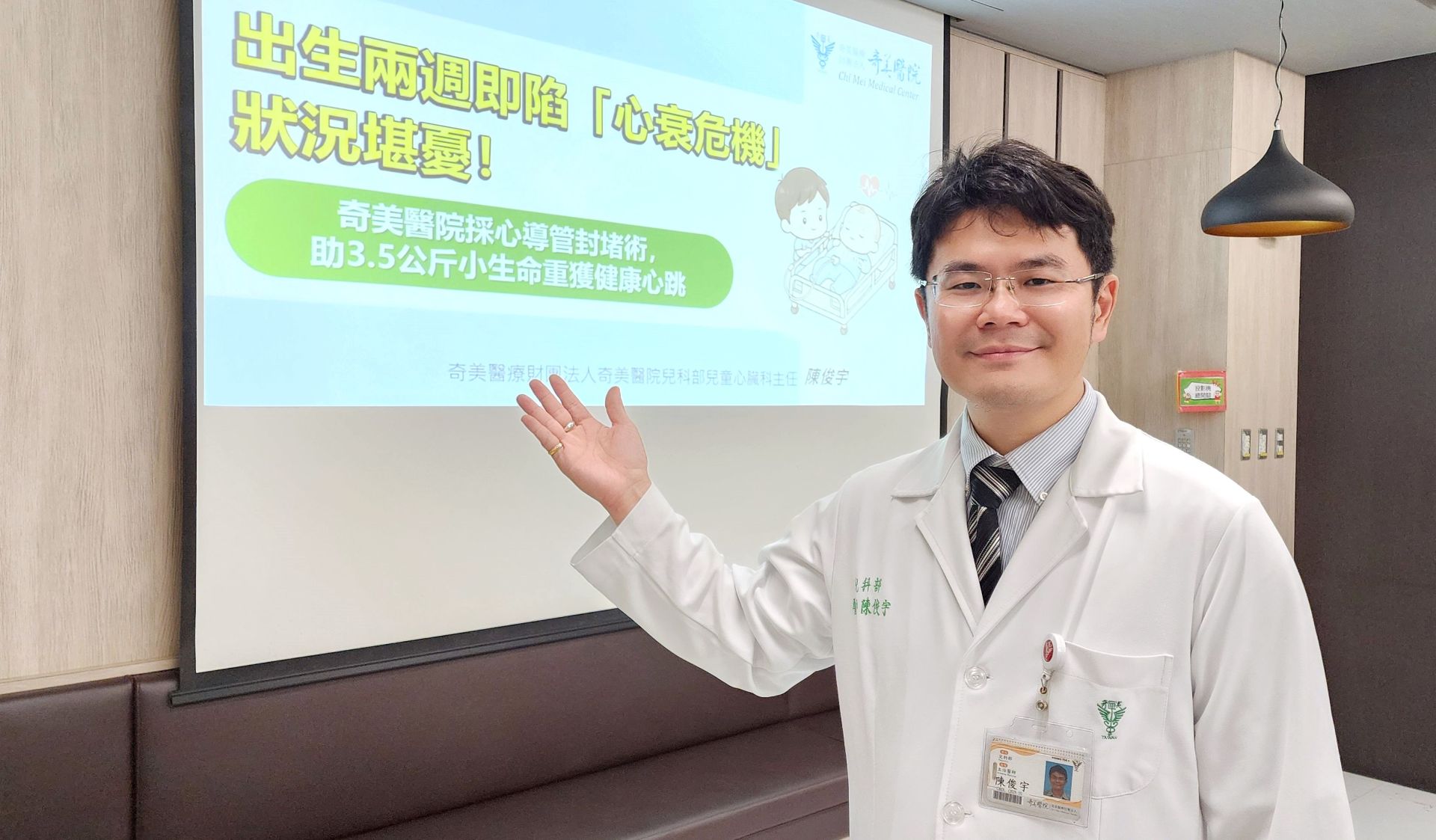 奇美醫療財團法人奇美醫院兒科部兒童心臟科主任陳俊宇表示,出生兩週男寶寶即陷「心衰危機」,狀況堪憂!奇美醫院採心導管封堵術,助3.5公斤小生命重獲健康心跳