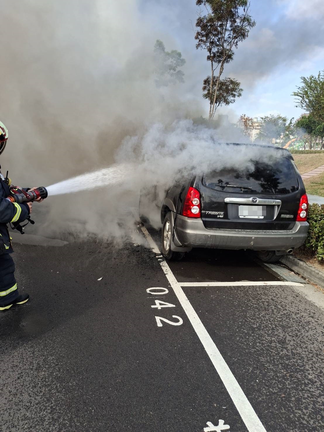 台中太平停車格內休旅車起火,消防隊員撲滅火勢發現車內一具焦屍。翻攝畫面