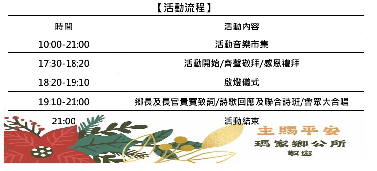 一年一度聖誕節活動,再次集結本鄉各宗教團體辦理聯合聖誕節活動,享 受天主所賜的一切。今年主題「馬槽有主•瑪家有愛」象徵著偉大、榮耀、神聖 的力量可以來自一個微乎其微的地方。 本鄉藉由與鄉民共同參與點燈的儀式傳 遞聖誕平安喜樂之意義,慶祝主耶穌為愛降生,點亮部落新希望,並賜福瑪家鄉 是善良、溫暖的家鄉,人人心中有愛,處處找的到幸福安慰。